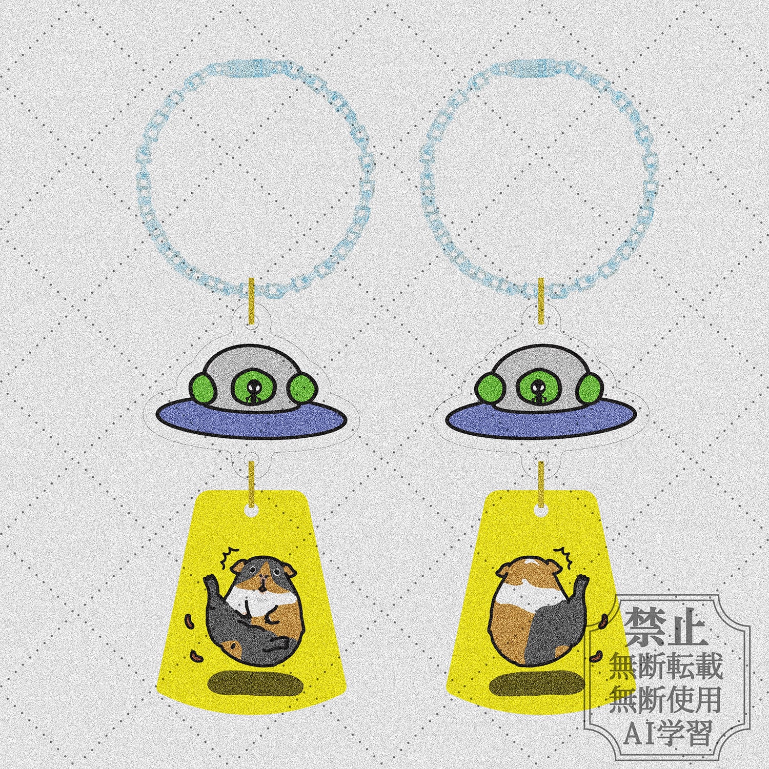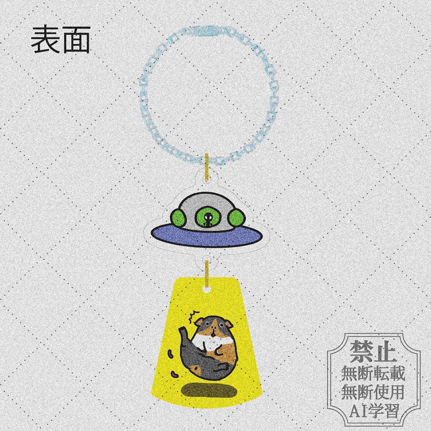 作者の飼いモル、ぷー子さんがアブダクションされている、ゆらゆらアクリルキーホルダーです。